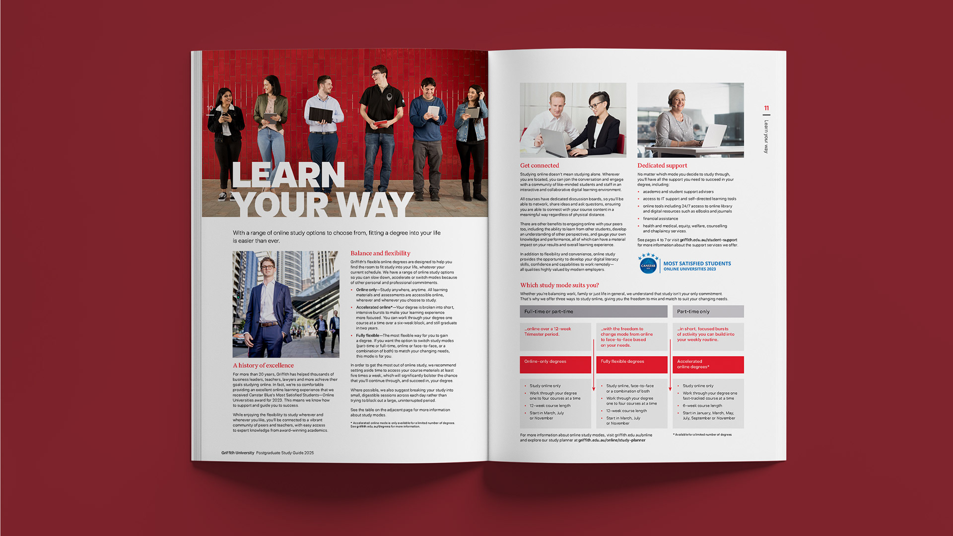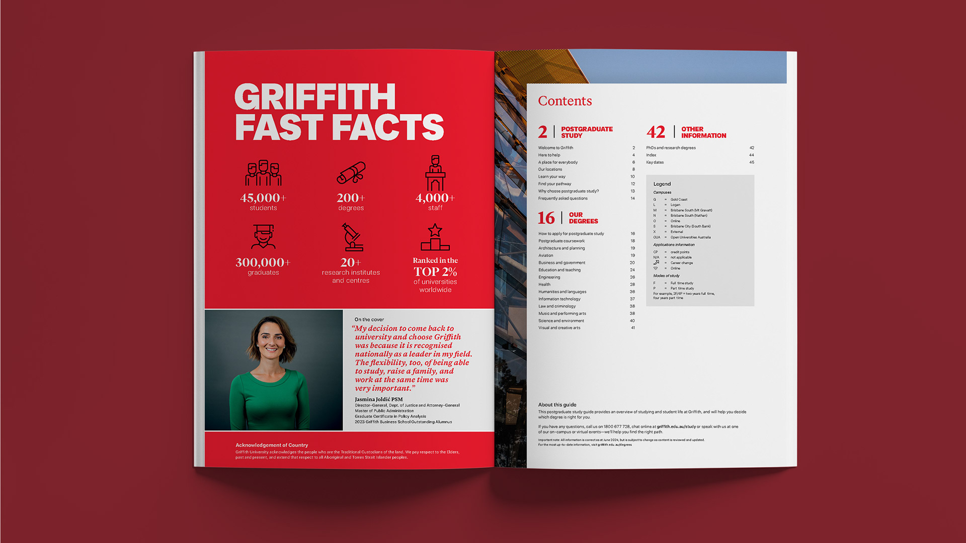 The Postgraduate Study Guide is the second-largest annual publication produced by Griffith University, distributed at major recruitment events including campus Open Day and TSXPO.