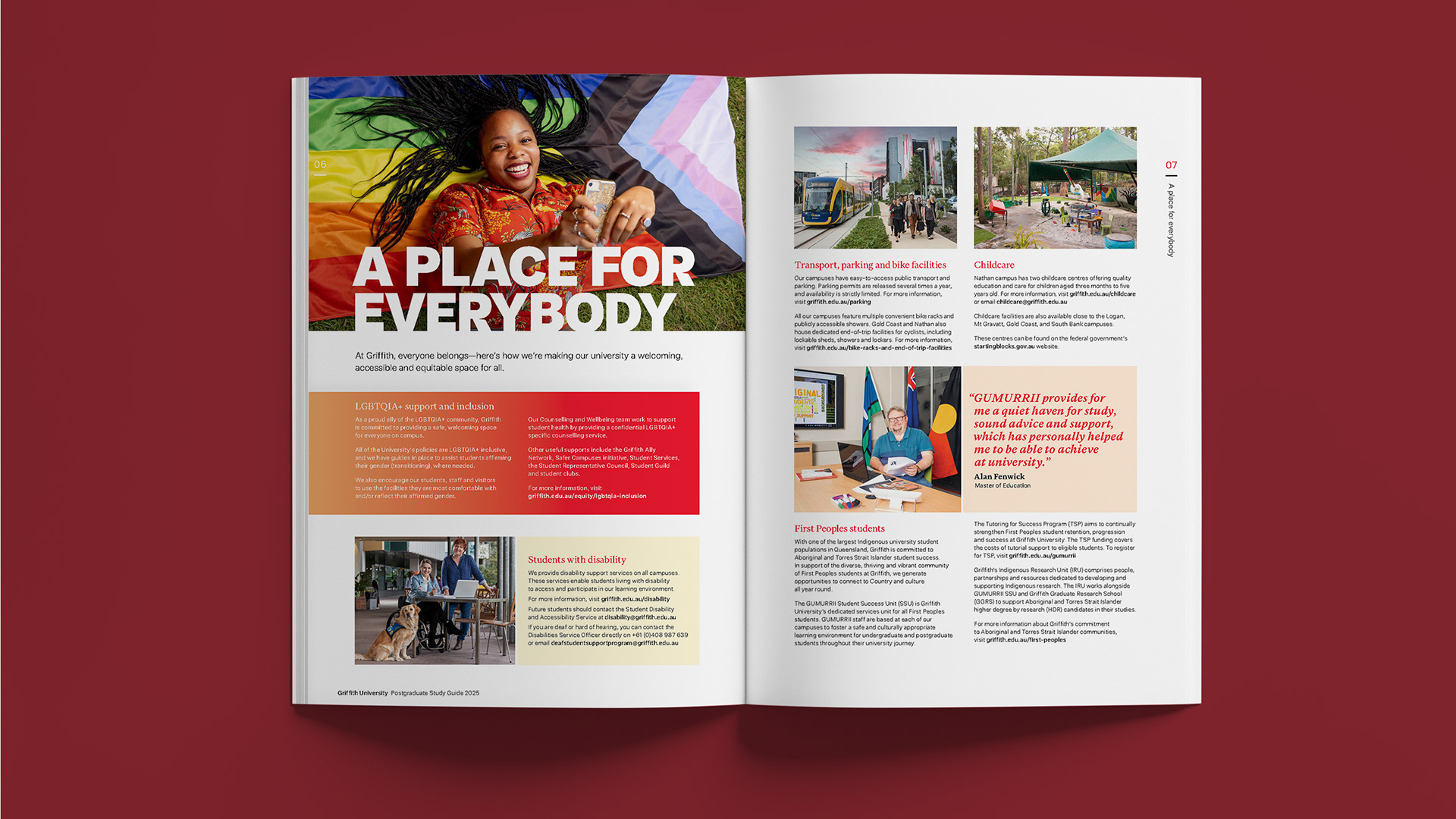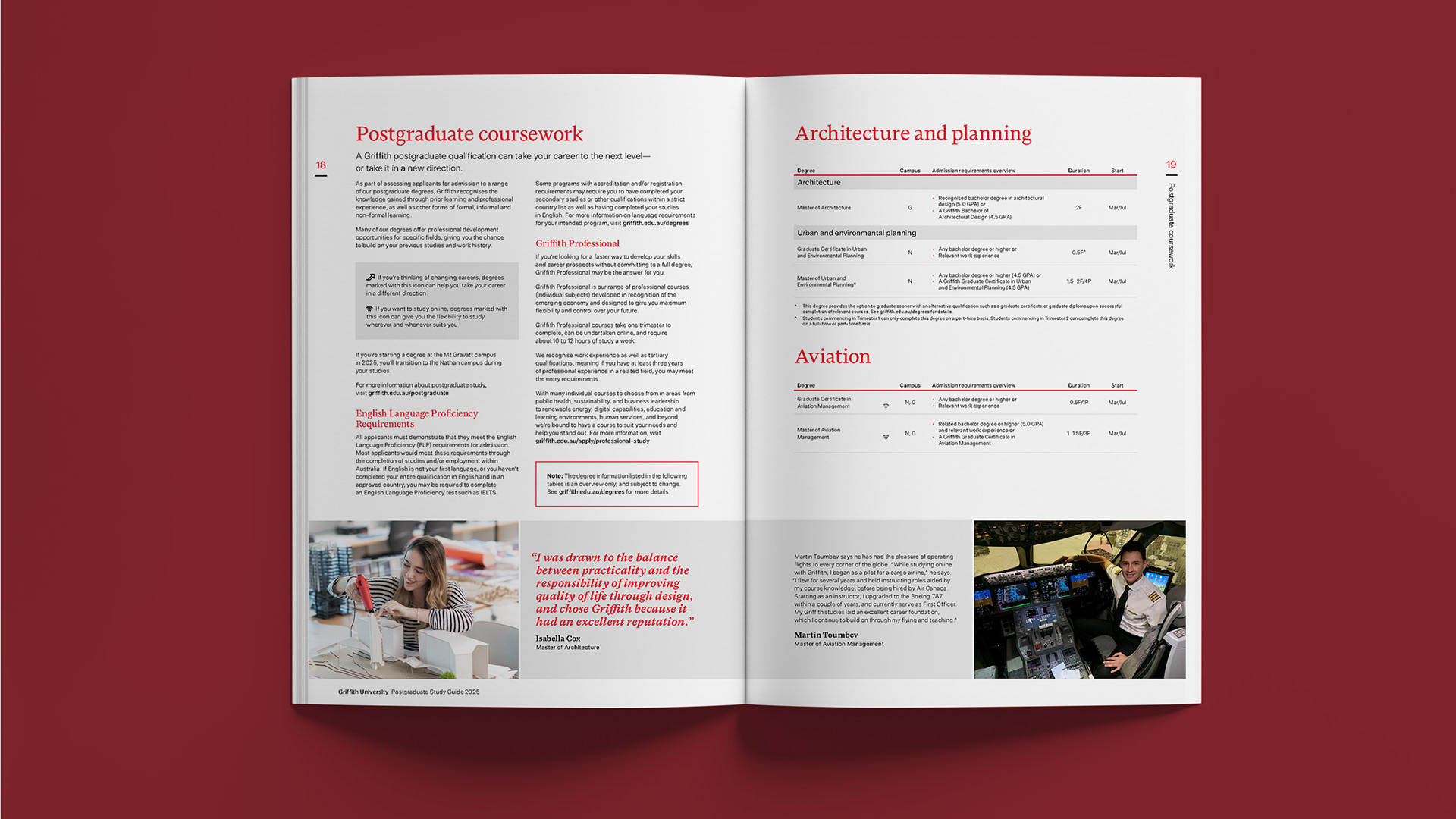 In 2025, Griffith’s Undergraduate Study Guide underwent a significant design refresh. I was responsible for translating the new magazine-inspired art direction into the Postgraduate Guide while maintaining clarity for a distinct audience.