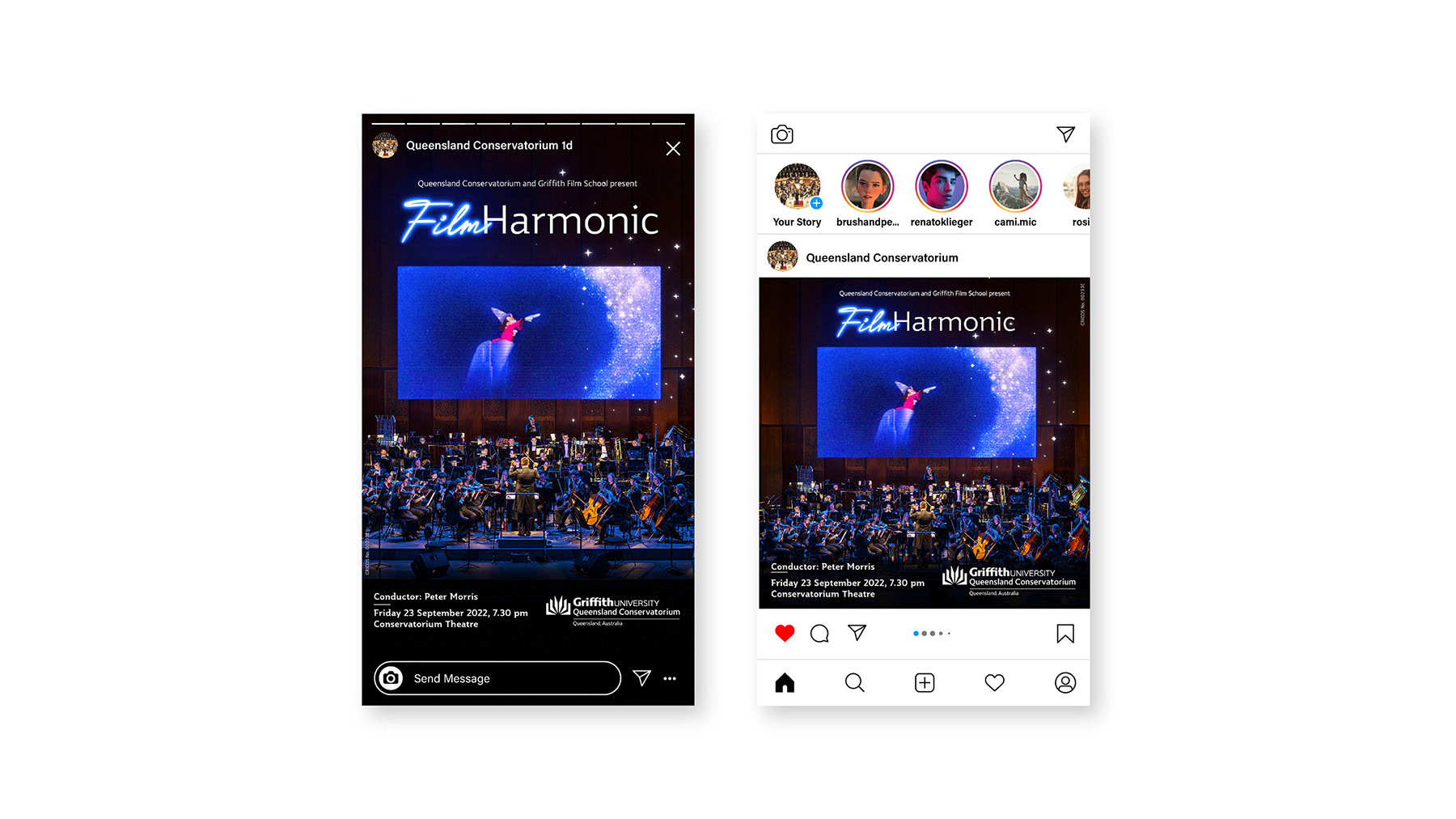 I designed the Film Harmonic campaign while working on the Content and Creative team at Griffith. In collaboration with Peter Morris, conductor and Deputy Director at the Queensland Conservatorium, I designed the campaign to emphasise the connection between the orchestra and the movie screening at the same time. To enhance the projection used during the performance, I applied a light paint effect on the title paired with the Griffith brand typography.